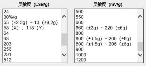 靈敏度(LSB/g<)主要針對數(shù)字輸出加速度傳感器,代表一個重力加速度(g)下,輸出能區(qū)分多少位LSB。上面已經(jīng)根據(jù)應(yīng)用要求推導(dǎo)出,假設(shè)應(yīng)用要求最小分辨率為1°,靈敏度需要大于58LSB/g。那么可以根據(jù)這一結(jié)果直接在參數(shù)欄里選擇。