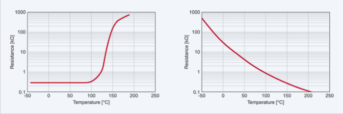 圖1.  PTC和NTC熱敏電阻的電阻特性。