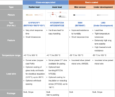 環(huán)氧樹(shù)脂涂層的NTC元件結(jié)構(gòu)堅(jiān)固,測(cè)量溫度通常在-55°C至+ 155°C之間,而玻璃封裝的NTC元件的測(cè)量溫度最高可達(dá)+ 300°C。對(duì)于需要極快響應(yīng)時(shí)間的應(yīng)用,玻璃封裝的元件是更合適的選擇。它們也更緊湊,直徑小至0.8mm。