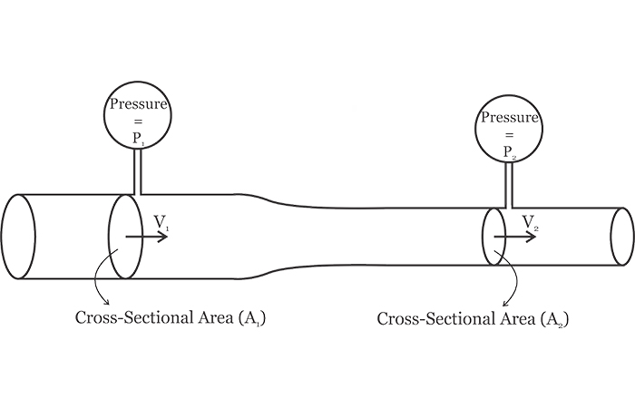 根據(jù)質(zhì)量守恒定律,質(zhì)量既不能創(chuàng)造也不能破壞。經(jīng)典力學(xué)中的這一原理以及有關(guān)流體流動(dòng)的一些假設(shè)可以幫助我們將流體通過的橫截面積(A)與流體速度(V)相關(guān)聯(lián)?紤]流體通過橫截面變化的管道的穩(wěn)定流動(dòng),如圖2所示。