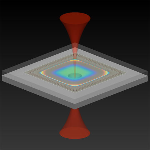 光機械加速度計的圖示,它使用光來測量加速度。NIST設(shè)備由兩個硅芯片組成,紅外激光在底部芯片進入,在頂部發(fā)射。頂部芯片包含由硅梁懸掛的標(biāo)準(zhǔn)質(zhì)量塊,該質(zhì)量塊使質(zhì)量塊可以響應(yīng)加速度自由上下移動。檢測質(zhì)量上的鏡面涂層和連接到底部芯片的半球形鏡形成光學(xué)腔。選擇紅外光的波長,使其與腔體的諧振波長幾乎匹配,從而使光在離開兩個反射鏡表面之間多次來回反射時逐漸增強強度。當(dāng)設(shè)備加速時,檢測質(zhì)量就會移動,從而改變腔體的長度并改變共振波長。這改變了反射光的強度。光學(xué)讀數(shù)將強度的變化轉(zhuǎn)換為加速度的量度。