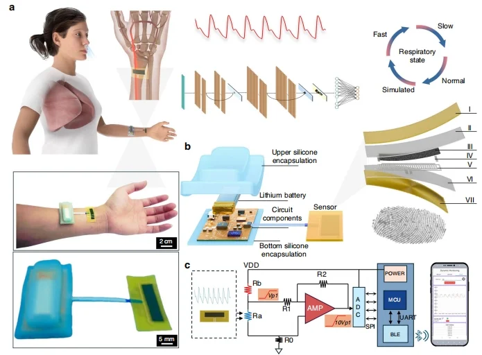 呼吸作為維持生命的基本生理過程,其狀態(tài)的長期監(jiān)測對呼吸系統(tǒng)疾病的預(yù)防與診斷至關(guān)重要。傳統(tǒng)呼吸監(jiān)測設(shè)備往往體積龐大,且需要胸帶束縛或貼近鼻腔,不僅影響用戶舒適度,還可能干擾監(jiān)測過程。近日,一項發(fā)表在《Microsystems & Nanoengineering》的研究帶來了突破性進展 —— 研究團隊開發(fā)出一種仿手指結(jié)構(gòu)的柔性壓力傳感器系統(tǒng),首次實現(xiàn)了從手腕脈搏波中直接提取呼吸信息,為可穿戴健康監(jiān)測領(lǐng)域開辟了新路徑。