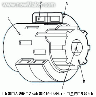 如圖4所示為非接觸式扭矩傳感器的典型結(jié)構(gòu)。輸入軸和輸出軸由扭桿連接起來,輸入軸上有花鍵,輸出軸上有鍵槽。當(dāng)扭桿受方向盤的轉(zhuǎn)動(dòng)力矩作用發(fā)生扭轉(zhuǎn)時(shí),輸入軸上的花鍵和輸出軸上鍵槽之間的相對(duì)位置就被改變了;ㄦI和鍵槽的相對(duì)位移改變量等于扭轉(zhuǎn)桿的扭轉(zhuǎn)量,使得花鍵上的磁感強(qiáng)度改變,磁感強(qiáng)度的變化,通過線圈轉(zhuǎn)化為電壓信號(hào)。信號(hào)的高頻部分由檢測(cè)電路濾波,僅有扭矩信號(hào)部分被放大。非接觸扭矩傳感器由于采用的是非接觸的工作方式,因而壽命長、可靠性高,不易受到磨損、有更小的延時(shí)、 受軸的偏轉(zhuǎn)和軸向偏移的影響更小,現(xiàn)在已經(jīng)廣泛用于轎車和輕型車中,是EPS傳感器的主流產(chǎn)品。