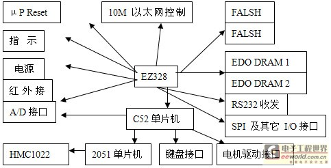 本文的課題背景是一個機器人玩具的控制系統(tǒng)設計,主芯片采用的是以摩特羅拉公司的MC86EZ328芯片,只完成與通信、運算等有關的主要操作,在沒有操作時,由運行于其上的操作系統(tǒng)uClinux來維護。對于所有與EZ328的核心運算、控制、通信、操作無關的外圍設備的維護和控制都通過一塊AT89C52來完成,它與EZ328的底層通信協(xié)議為同步串口協(xié)議(SPI),在AT89C52中由軟件來實現(xiàn)。C52包含的部件主要是A/D轉(zhuǎn)換器,鍵盤接口,電機驅(qū)動模塊。硬件結構電路圖如下圖1: