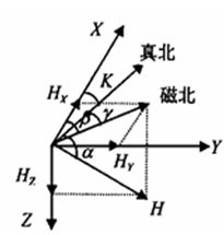 HMC的輸出電壓為磁場強度為0時傳感器的輸出。所以當U0為0時, Uout正比于磁場強度B。如圖4,假設機器人處于水平面上,X為機器人行進方向,Y為水平面上垂直X的方向向右(即X順時針轉(zhuǎn)90),地里北極方向和地磁北極方向如圖所示。H為地磁場,Hx、Hy分別是H在X、Y方向的水平分量, β為機器人行進方向和地磁北極方向的夾角, γ為地磁北極和地理北極方向的夾角,K就是機器人行進方向與地理北極方向之間的夾角,也就是我們最終要求的角度。(此處的β、γ、 K都是由前者出發(fā)順時針到達后者的角度)由圖可明顯看出,K= β-γ。而在地球上不同方位的γ可查表得出,所以關鍵就是求得 。由磁阻傳感器可以得出Hx、Hy,(此處忽略了機器人在Z軸方向的傾斜,所以二維傳感器就夠用了),