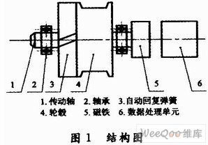 基于磁敏角度技術(shù)的拉線式位移傳感器的功能是將拉線的機(jī)械位移換成可以計(jì)量、記錄或傳送的電信號,主要由自動回復(fù)彈簧、輪轂、磁鐵以及數(shù)據(jù)處理單元等部分構(gòu)成,結(jié)構(gòu)如圖1所示。