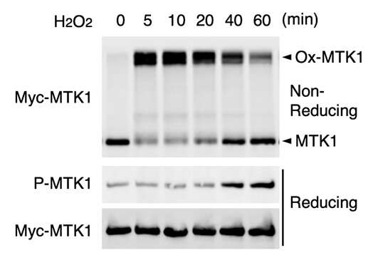 氧化應激誘導的MTK1活化需要MTK1的氧化和還原。將細胞用H2O2處理指定的時間。細胞提取物在非還原條件下進行電泳,并用抗Myc抗體進行免疫印跡(上圖)。免疫沉淀的Myc-MTK1在還原條件下進行電泳,并用抗P-MTK1或抗Myc抗體(中間和底部)進行探測。圖片來源:東京大學醫(yī)學科學研究所