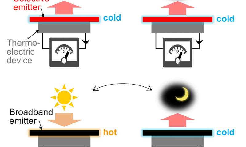 在本周于《應(yīng)用物理學(xué)快報(bào)》上發(fā)表的一項(xiàng)研究中,作者測(cè)試了一種由波長(zhǎng)選擇發(fā)射器組成的熱電設(shè)備,該設(shè)備在白天使用輻射冷卻不斷地冷卻該設(shè)備,使熱能從設(shè)備中散布到空氣中。結(jié)果,設(shè)備的頂部比底部的溫度更低,從而導(dǎo)致溫差,從而在白天和黑夜以及各種天氣條件下產(chǎn)生恒定電壓。