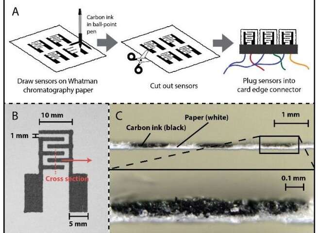 (A)紙基電子氣體傳感器(PEGS)的制造。碳電極用圓珠筆和切刀繪圖儀打印在WhatmanTM纖維素色譜1紙上,可快速制作所需幾何形狀的原型。打印完成后,將傳感器切割并放置在卡式邊緣連接器內(nèi)以進行表征。(B)單個PEGS的俯視圖,該PEGS由兩個帶有三個手指的電極組成,每個手指之間的間距為1 mm。(C)跨三個手指的PEGS的橫截面(B中的紅色虛線)。碳墨水(黑色)部分滲入紙張(白色)。圖片來源:ACS Sensors(2019)。DOI:10.1021 / acssensors.9b00555