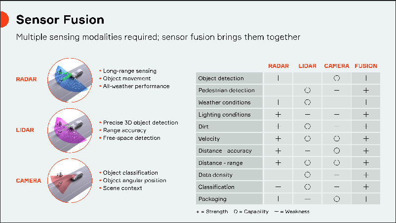 每種傳感器類型或“模態(tài)”都有其固有的優(yōu)點和缺點。雷達(dá)即使在惡劣的天氣條件下也能準(zhǔn)確確定距離和速度,但非常強(qiáng)大,但無法讀取路牌或“看到”交通信號燈的顏色。相機(jī)可以很好地讀取標(biāo)志或?qū)ξ矬w進(jìn)行分類,例如行人,騎自行車的人或其他車輛。但是,它們很容易被灰塵,陽光,雨水,雪或黑暗所蒙蔽。激光雷達(dá)可以準(zhǔn)確地檢測物體,但是它們沒有相機(jī)或雷達(dá)的承受能力或承受能力。