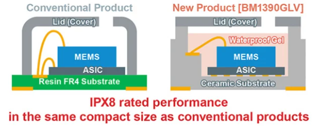 BM1390GLV 中采用的 MEMS 和控制電路可能與其他類似產(chǎn)品沒(méi)有太大區(qū)別;然而,新傳感器采用專有結(jié)構(gòu)和特殊的防水凝膠,使其適用于需要防水性能的工業(yè)設(shè)備和家用電器。