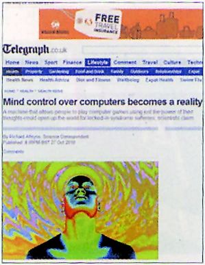 美國科學(xué)家近日研發(fā)出“人腦聯(lián)機”設(shè)備。研究團隊招募了12位患有癲癇病的志愿者,這些病人為控制病情都在腦中植入了監(jiān)控神經(jīng)活動的傳感器。通過訓(xùn)練,志愿者嘗試僅用思想開啟或關(guān)閉某個神經(jīng)末梢或神經(jīng)元。目前志愿者已經(jīng)可以控制電腦屏幕中光標(biāo)的移動,以及圖片的亮度調(diào)節(jié)。