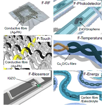 除了上述用于制造智能紡織產(chǎn)品的導(dǎo)電材料外,包括傳感器和執(zhí)行器在內(nèi)的有源電子設(shè)備也是集成到織物中的重要組件。射頻 (RF) 天線、光電探測器、溫度傳感器和 LED 也是這些設(shè)備中的常見組件。