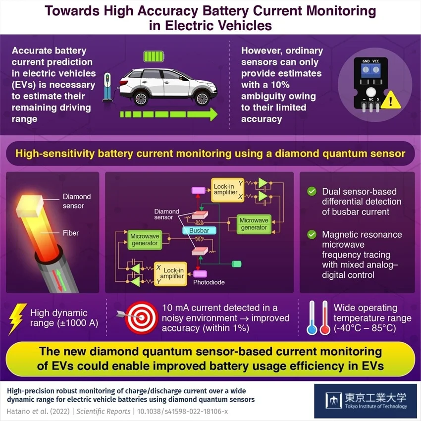 幸運(yùn)的是,由東京工業(yè)大學(xué)(Tokyo Tech)的 Mutsuko Hatano 教授領(lǐng)導(dǎo)的日本研究團(tuán)隊(duì)現(xiàn)在已經(jīng)提出了解決方案。在他們發(fā)表在《科學(xué)報(bào)告》上的研究中,該團(tuán)隊(duì)報(bào)告了一種基于金剛石量子傳感器的檢測(cè)技術(shù),該技術(shù)可以在測(cè)量電動(dòng)汽車(chē)典型的高電流時(shí)以 1% 的準(zhǔn)確度估計(jì)電池電量。