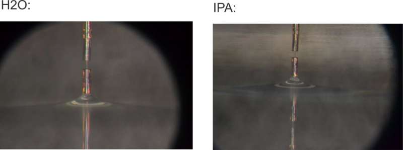 研究人員使用新傳感器通過測量從水(左)和異丙醇(右)中取出微型圓柱體時的回縮力來測量液體的表面張力。圖片來源:馬里博爾大學 Denis Donlagic