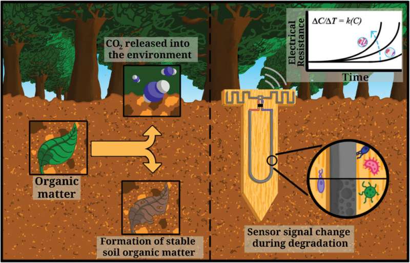 分解傳感器的概念,其中可生物降解的導電痕量的侵蝕速率與土壤中的微生物活動相關(guān)。