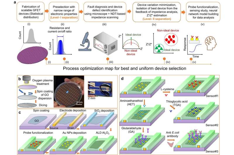 石墨烯基場效應(yīng)晶體管(GFET)傳感器陣列的晶圓級納米制造和功能化。一種原理圖納米制造策略,使用阻抗測量進(jìn)行器件預(yù)選(故障診斷),以小化器件變化,以實(shí)現(xiàn)近乎理想的響應(yīng)模式。測試/分析程序的每個(gè)步驟都示意性地顯示(i-v),并在插圖中附有相應(yīng)的描述。b 將氧化石墨烯(GO)分散液旋涂到整個(gè)晶圓基板上,用于沉積圖案電極。照片顯示了切割后的晶圓尺寸傳感器器件和表面有一滴測試溶液的單個(gè)器件。c 基于rGO的FET傳感器器件的納米制造步驟包括通過電子束光刻進(jìn)行電極沉積,SiO的沉積2使用電子束光刻、3 nm 原子層沉積 (ALD) 衍生的 Al 在電極上的保護(hù)層2O3作為頂部柵極氧化物,濺射金納米顆粒(NPs)作為探針的錨定位點(diǎn),并實(shí)現(xiàn)探針功能化。d 傳感器1-3使用特定生化和抗體探針進(jìn)行探針功能化的示意圖步驟。自然通訊 (2023)。DOI: 10.1038/s41467-023-39701-0