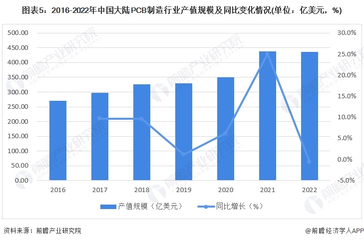2016-2022年,中國(guó)PCB產(chǎn)值規(guī)模整體呈現(xiàn)波動(dòng)上漲的態(tài)勢(shì)。2021年,由于需求復(fù)蘇、技術(shù)要求升級(jí)以及原材料價(jià)格大幅度上漲等因素影響,推動(dòng)中國(guó)PCB產(chǎn)值強(qiáng)勁增長(zhǎng)。2022年,中國(guó)PCB產(chǎn)值規(guī)模達(dá)到435.5億美元(按照美元口徑),同比下降0.7%。
