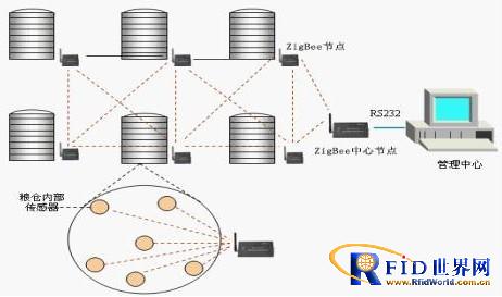 本系統(tǒng)是采用最先進(jìn)的ZigBee無(wú)線傳輸技術(shù)。在糧庫(kù)的不同地方分置溫濕度傳感器,溫濕度傳感器是采用無(wú)線傳輸,將現(xiàn)場(chǎng)測(cè)量到的數(shù)據(jù)通過(guò)無(wú)線電磁波,傳送給糧庫(kù)內(nèi)的讀寫(xiě)器,讀寫(xiě)器再通過(guò)無(wú)線中繼器,將數(shù)據(jù)無(wú)線傳輸給電腦,電腦將接受到的數(shù)據(jù)存儲(chǔ),并與系統(tǒng)設(shè)定的標(biāo)準(zhǔn)值比較。若現(xiàn)場(chǎng)值超出標(biāo)準(zhǔn)值,系統(tǒng)會(huì)報(bào)警告知管理人員,并會(huì)自動(dòng)的控制風(fēng)機(jī)等設(shè)備作降溫處理。