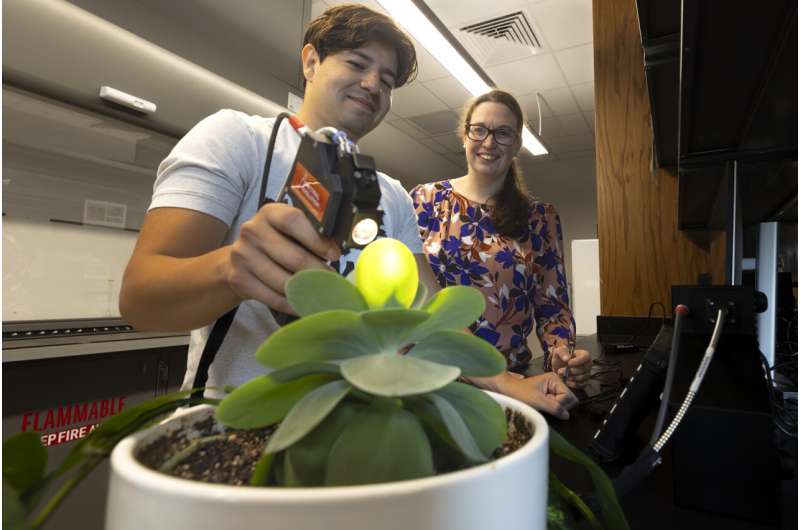 作物、土壤與環(huán)境科學系碩士研究生馬里奧・索托(左)和農(nóng)業(yè)分部及戴爾・邦珀斯農(nóng)業(yè)、食品與生命科學學院精準農(nóng)業(yè)助理教授奧雷莉・龐塞,展示了一項用于測量除草劑對植物有效性研究的設備。圖片來源:阿肯色大學系統(tǒng)農(nóng)業(yè)分部