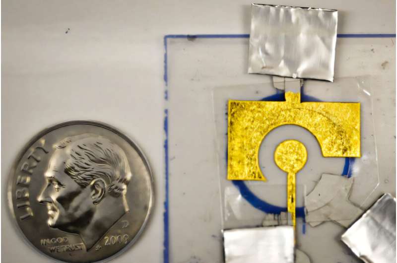 阿里爾・弗斯特實(shí)驗(yàn)室開發(fā)的電化學(xué)傳感器由附著在廉價(jià)金箔電極上的 DNA 組成,該電極被層壓在塑料片上。圖片來源:研究人員提供;麻省理工學(xué)院新聞編輯
