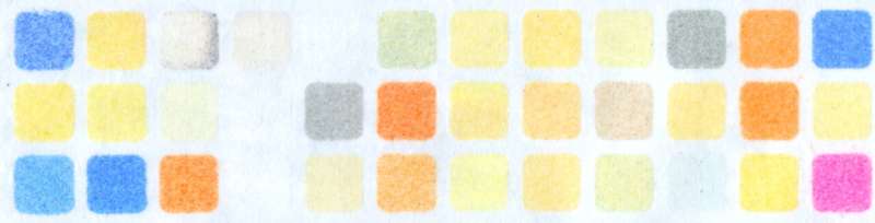 為驗(yàn)證概念可行性,塔克團(tuán)隊(duì)通過以下步驟制備傳感器:首先將二氧化硅微米顆粒浸泡在 36 種不同的變色染料溶液中;待顆粒風(fēng)干后,將其放入微孔板,在板上覆蓋一張粘性試紙,隨后翻轉(zhuǎn)微孔板,使含染料的二氧化硅顆粒壓印在試紙上,最終形成一個 12×3 的變色傳感陣列。為給陣列提供結(jié)構(gòu)支撐,研究人員還在試紙的粘性底面貼上了一張薄金屬片。