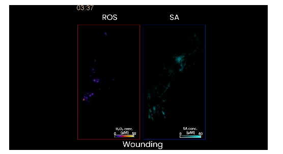 葉片上的一對傳感器由左側(cè)的雙氧水傳感器和右側(cè)的水楊酸傳感器組成。當(dāng)植物受傷時,如本例,左側(cè)會有移動波形響應(yīng),但水楊酸的產(chǎn)生非常少。這就是受傷的應(yīng)力信號。相反,當(dāng)植物受到過熱、過強光或細菌感染的壓力時,不同波形的水楊酸伴隨左側(cè)的雙氧水波。圖片來源:自然傳播(2024年)。DOI:10.1038/s41467-024-47082-1