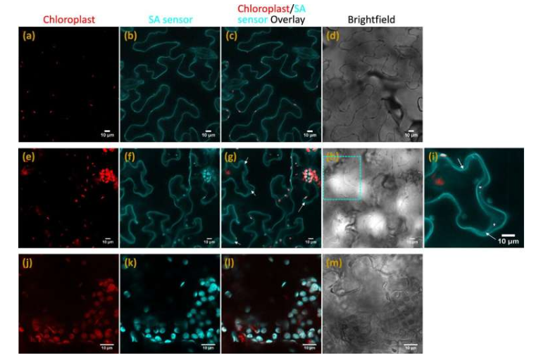 活體植物中SA納米傳感器的亞細胞定位。用SA傳感器浸透的煙草葉共焦圖像,以可視化SA傳感器的亞細胞定位:a、e、j 葉綠素自發(fā)熒光(紅色)、b、f、kSA傳感器 青色熒光、c、g、l覆蓋和(d, h, m)明場。第1行——SA在表皮細胞外周觀察到熒光,表明細胞質(zhì)定位。第2行——質(zhì)溶化表皮細胞,顯示由縮小的原生質(zhì)體形成的胞膜空間中SA傳感器熒光,如箭頭所示。i 放大疊加圖像,來自 g 的單元格。圖片來源:自然傳播(2024年)。DOI:10.1038/s41467-024-47082-1