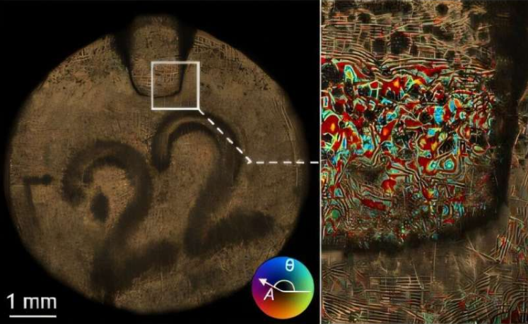 MASI成像技術(shù)拍攝的彈殼圖像。上圖:捕獲的復(fù)雜電場包含振幅(亮度)和相位(顏色)信息。下圖:該數(shù)據(jù)能夠以微米級(jí)分辨率進(jìn)行三維重建,顯示擊針印痕——這一獨(dú)特的標(biāo)記可以將彈殼與特定槍支聯(lián)系起來。圖片來源:康涅狄格大學(xué)