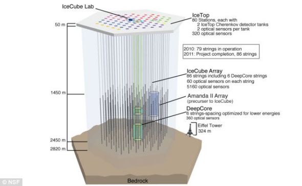 冰立方中微子天文臺是建在南極的一個巨型望遠鏡,它的目的是發(fā)現(xiàn)以光速穿過地球的中微子,這是一種令人難以捉摸的亞原子粒子。盡管科學(xué)家利用冰立方收集數(shù)據(jù)的時間已經(jīng)長達數(shù)年,但是它的建設(shè)工作直到上周末才結(jié)束。人們對中微子知之甚少,但是認(rèn)為它們攜帶著有關(guān)我們的星系和神秘黑洞誕生的信息。