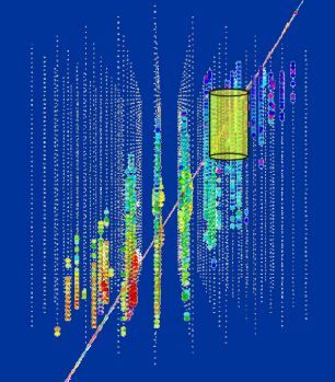 冰立方將會把南極μ介子及中微子探測器列陣(黃色圓柱體)團團圍住,后者是一個更小的中微子探測器。彩色斑點顯示的是通過冰立方陣列的中微子的路徑,這是由電子光學(xué)組件發(fā)現(xiàn)的。
