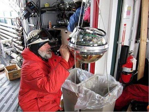 冰立方建設(shè)小組的成員在測試傳感器(圖左部分顯露),另一位科學(xué)家正在將一個單獨的傳感器掛在電纜上。天文臺區(qū)別于兩個輔助探測器的主探測器被安置在體積為一平方公里的冰層中,而南極是唯一能找到如此巨大冰塊的地方。美國國家科學(xué)基金會表示,天文臺的規(guī)模越大就越靈敏,因為面積的增加意味著中微子和水核的碰撞就越有可能被觀測到。