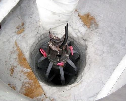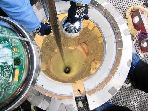 冰立方增強型熱水鉆的鉆頭從冰層中顯露出來。鉆出一個冰洞需要耗費18170升的汽油,并融化掉757立方米的冰塊。