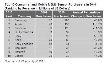 IHS iSuppli稱,2010年蘋果采購MEMS傳感器的支出達(dá)到了1.95億美元,同比增長116.7%,僅比第一大MEMS傳感器采購商三星少500萬美元。