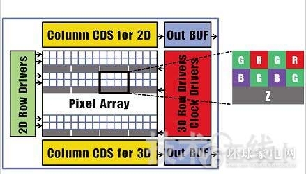 Z像素的大小為2.25μm×9.0μm,相當于四個RGB單個像素的面積。Z像素與RGB像素相鄰,位于下側(cè)。在像素區(qū)域的上下方分別設置了用于RGB像素和用于Z像素的列線(Column)CDS電路。另外,由于有Z像素而缺失的RGB像素信息可以通過圖像處理算法進行插值補償。