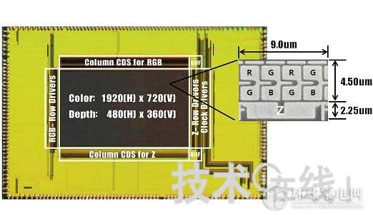 新的圖像傳感器的RGB圖像的像素為1920×720,距離圖像的像素為480×360。開口率為48%。RGB部分的像素間距為2.25μm,采用普通的RGBG排列。