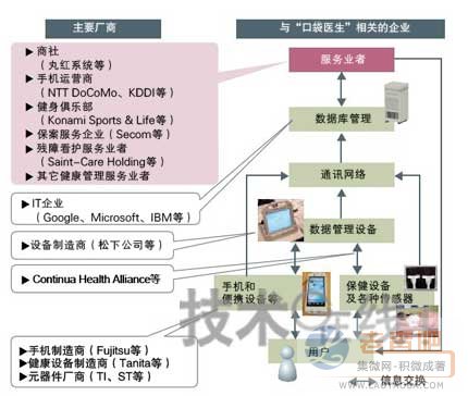 圖中所示為“口袋醫(yī)生”企業(yè)架構(gòu)及主要相關(guān)廠商。圖下部各種設(shè)備的開發(fā)此前已取得了進(jìn)展,而近來(lái),圖上部的服務(wù)商的行動(dòng)也日益活躍。