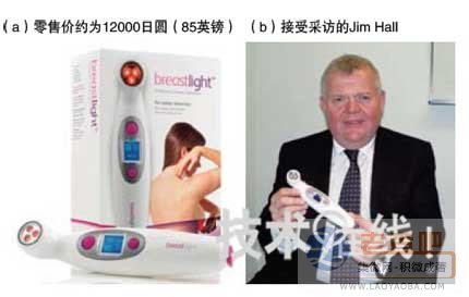 PWB Health公司研發(fā)和銷售的“Breastlight”家用乳癌傳感器(a)及該公司董事長(zhǎng)Jim Hall(b)。