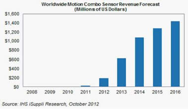 2012年,組合運動傳感器的收益將上升到一億八千九百萬美元,而在2011年只有2300萬美元。組合傳感器雖然已經(jīng)存在了四年,前三年期間的收入是微不足道的,因為缺乏產(chǎn)品供給,該市場于2011年才開始起飛。