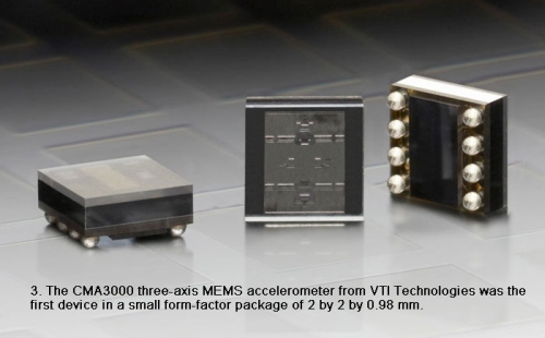 VTI Technologies、意法半導(dǎo)體和Bosch Sensortec等MEMS IC制造商,通過(guò)使傳感器更小、更省電來(lái)進(jìn)一步擠壓基于MEMS技術(shù)的芯片尺度的邊界。去年,VTI Technologies率先推出了小尺寸三軸MEMS加速度計(jì)——CMA3000(圖3)。這款三軸、低功耗(10μA/1.8V)加速度計(jì)采用2×2×0.98mm封裝。