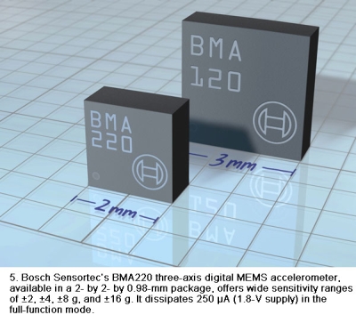 領(lǐng)先的MEMS傳感器供應(yīng)商Bosch Sensortec也縮小了其MEMS加速度計(jì)的體積(圖5),其三軸數(shù)字加速度計(jì)BMA220具有與ST同類產(chǎn)品一樣的小巧體積(2×2×0.98mm),但具有±2、±4、±8和±16g更寬的靈敏度范圍。在全功能模式,該芯片的功耗為250μA(1.8V電源)。此外,根據(jù)不同占空比,其功耗可低至10μA。BMA220是完全可編程的,具有單點(diǎn)、雙點(diǎn)、自動(dòng)喚醒、振動(dòng)、中斷和高加速/低加速檢測(cè)、可配置步長(zhǎng)以及I2C和SPI接口。