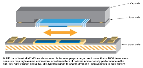 惠普(HP)實(shí)驗(yàn)室的超靈敏慣性MEMS加速度計(jì)平臺(tái)(圖6)是MEMS的一個(gè)重要發(fā)展,它比大批量商用加速度計(jì)敏感1,000倍以上,且成本低、體積小。它具有亞100 ng√Hz范圍的噪聲密度表現(xiàn)以及130dB的動(dòng)態(tài)范圍從而大幅提高了數(shù)據(jù)質(zhì)量,這一切要?dú)w功于使用了大的檢測(cè)質(zhì)量(proof mass)