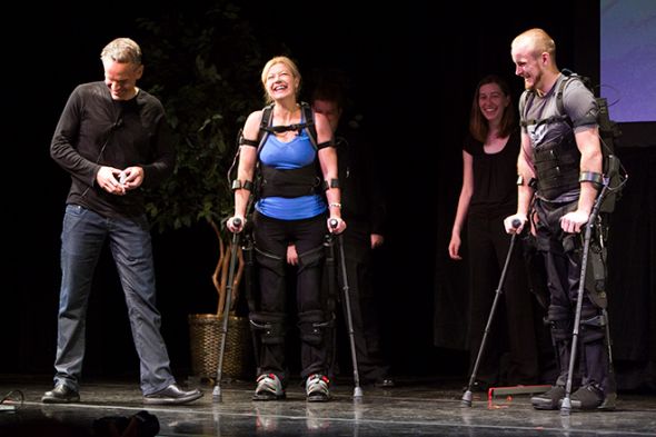 “eLEGS”,由一個機械框架組成,機械框架通過拐杖進行控制,拐杖中含有傳感器!癳LEGS”的電池能夠保證使用者行走一整天。