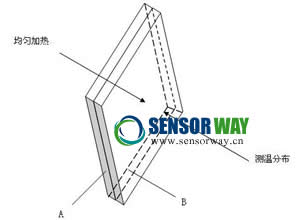如圖所示,均勻地加熱A板,當A板溫度升高時,熱量就向B板流去,B板溫度也隨之升高。如果兩板交界面焊接良好,熱量將均勻地流向B板子,B板表面的溫度應該是均勻一致的。如果交界面某一部位沒有焊接好,熱流流到這里就會受到阻礙,B板外表面與此部位相對應的位置上就會出現(xiàn)溫度異常的現(xiàn)象。