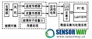 本設計將LabVIW軟件、多傳感器、計算機結(jié)合,構建了一個空氣流量測試系統(tǒng),實現(xiàn)對多傳感器信息的融合。系統(tǒng)包括被測對象、傳感系統(tǒng)、信號調(diào)理電路、數(shù)據(jù)采集與處理系統(tǒng),系統(tǒng)框圖如圖1所示。
