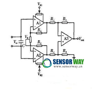 在許多需要數(shù)字采集的系統(tǒng)中,傳感器輸出的模擬信號都很微弱,必須通過1個模擬放大器對其進行一定倍數(shù)的放大,才能滿足采集卡對輸入信號電平的要求,這種情況下,就需要采用信號調(diào)理電路對傳感器輸出的信號量進行放大。信號調(diào)理電路使輸出電壓與輸入電壓成正比,它的核心是1個具有電容負反饋、且輸入阻抗極高的高增運算放大器。差動儀表放大器如圖2所示。