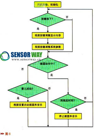 以10Hz的頻率檢測(cè)加速度傳感器,定時(shí)器中斷程序啟動(dòng)AD轉(zhuǎn)換器,主程序中檢測(cè)到AD轉(zhuǎn)換完成則把結(jié)果保存起來(lái),通過(guò)和零值比較,如果大于閾值,則認(rèn)為嬰兒活動(dòng),根據(jù)設(shè)置參數(shù)啟動(dòng)電機(jī)、音樂(lè)。