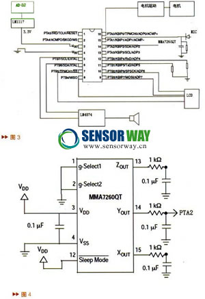 系統(tǒng)使用新的MMA7260QT三軸加速度傳感器作為主要傳感器,內(nèi)部信號(hào)調(diào)理,內(nèi)置濾波,量程可選,性能穩(wěn)定可靠,設(shè)計(jì)起來(lái)相當(dāng)簡(jiǎn)潔方便。