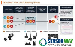 如果我們將IoT的標(biāo)準(zhǔn)模塊從簡(jiǎn)單的節(jié)點(diǎn)看作產(chǎn)品,我們得到的將是使用PAN/BAN/LAN類型通信拓?fù),連接到采用不同分層結(jié)構(gòu)網(wǎng)關(guān)的傳感節(jié)點(diǎn)/邊緣節(jié)點(diǎn)。這些網(wǎng)關(guān)使用WAN通信技術(shù)與云進(jìn)行通信。