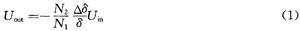 式中:Uin為勵磁電源電壓(單位V);Uout為輸出電壓(單位V);N1,N2分別為勵磁線圈和輸出線圈的匝數;△δ為軸偏移平衡位置的距離(單位mm);δ占為軸處于平衡位置時的氣隙大小(單位mm)。